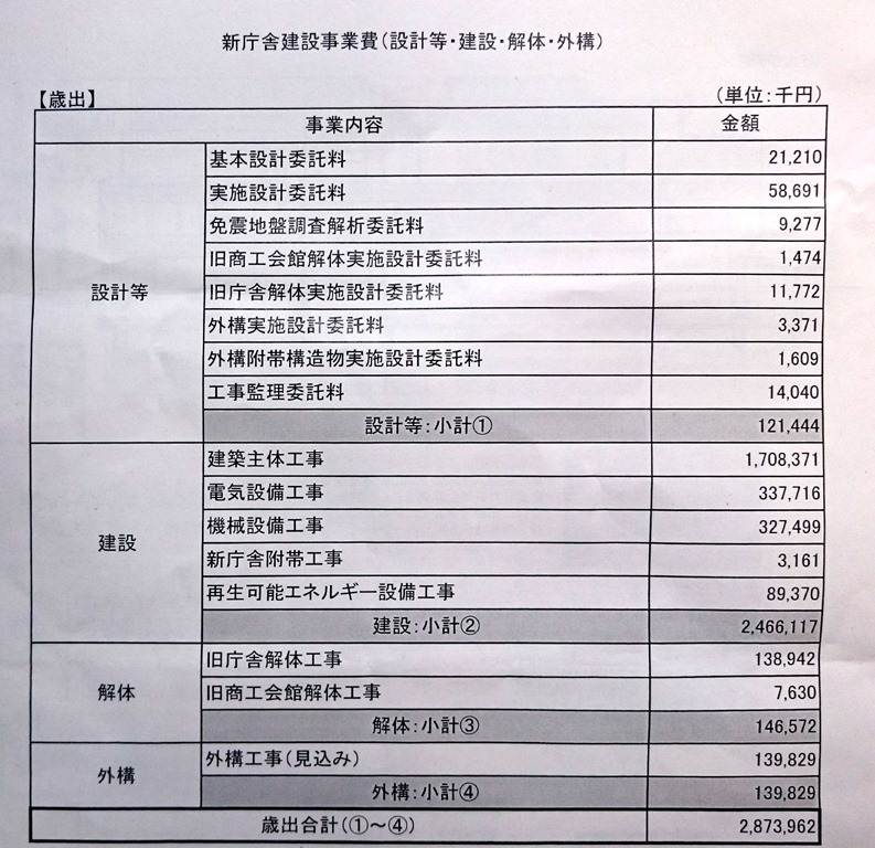 上の表は、昨日の説明資料の中にあった「幕別町新庁舎建設事業費」の詳細です。