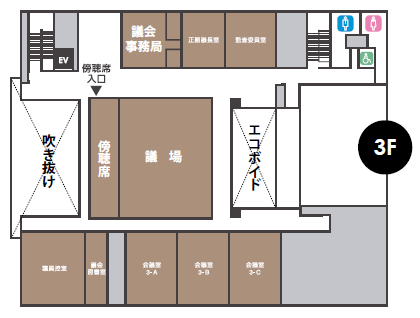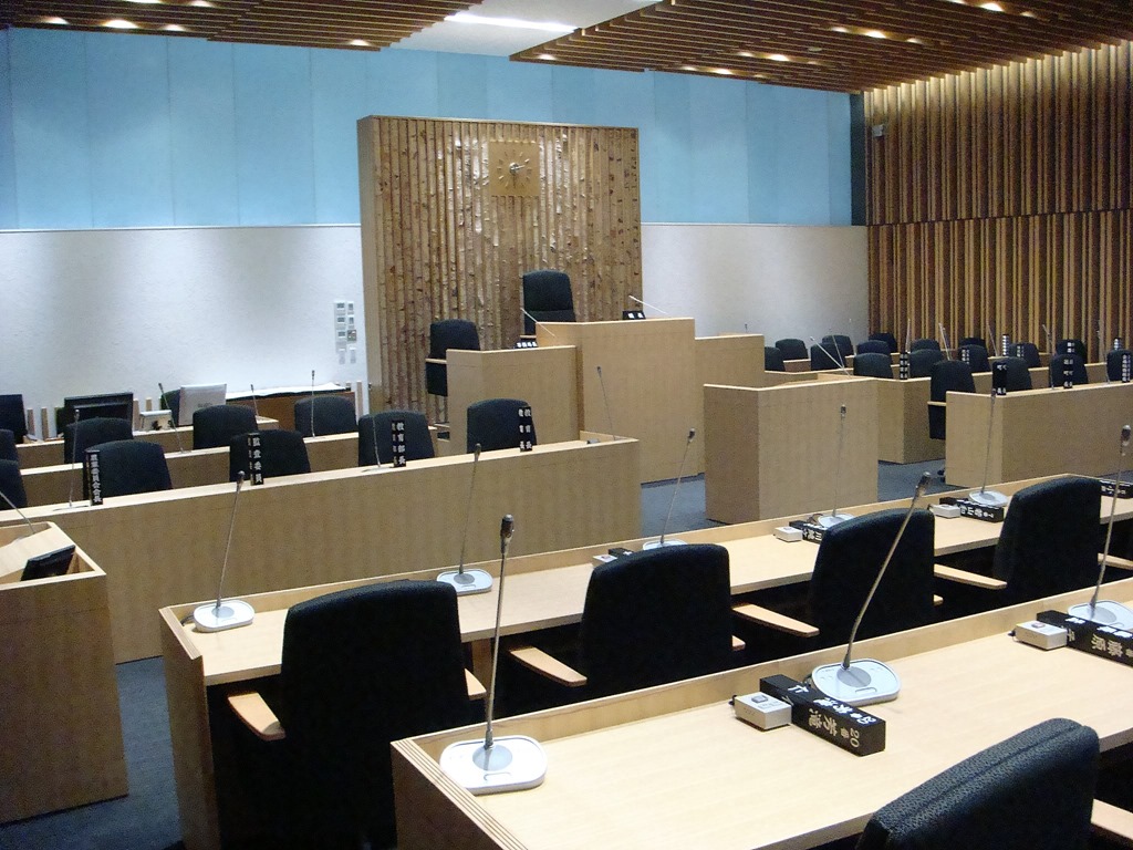 傍聴席は後方の議員席(前方より17cmほど上がっています)と同じ高さになっていました。砂川市議会の傍聴席のように2階から見下ろすような位置ではありません。