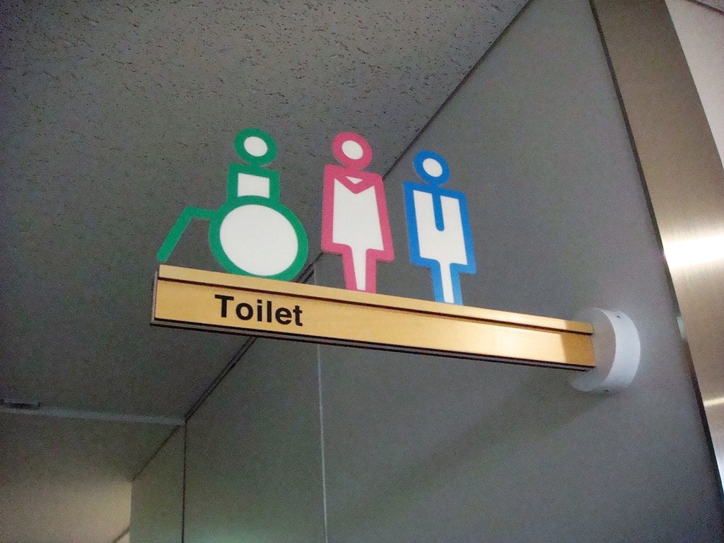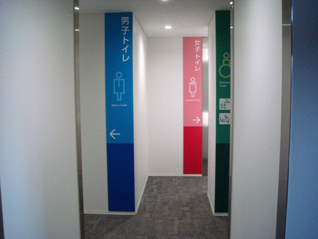 左は一階窓口、真ん中は正面玄関を入った吹き抜け、右は各階の奥にあるトイレです。