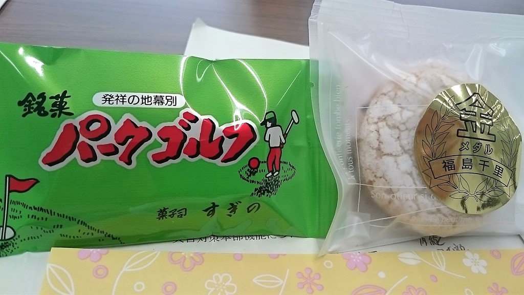 最後に左はちょっと目立たないのですが、可愛いトイレのサインです。そして、右の写真は説明を受けている時にいただいたお菓子です。さすがにパークゴルフ発祥の地、そして、陸上の福島千里選手出身の幕別町らしいです。