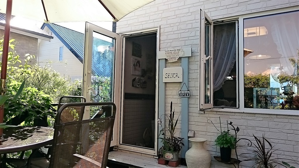 図々しく家の横を入っていくと左の写真のような入り口がカフェ・セイラです。内部は右の写真。オーナーは自分で絵も描かれるそうで、先ほどの看板は自作です。
