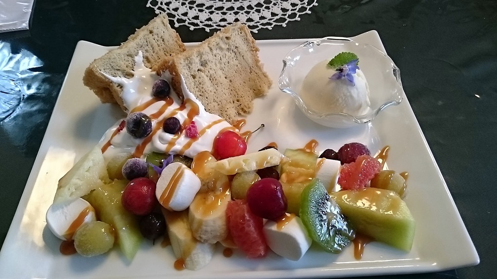 コーヒーなど飲み物の他、ランチも提供しています。小腹が空いていたのでデザート・メニューから「シフォンケーキセット(ドリンク付き 900円)」を頼みましたが、出てきて思わず声が出たのが下の写真です。