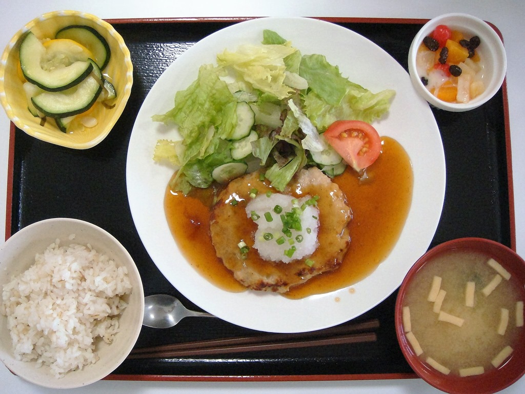 右の写真は私が食べた「バランスランチ(580円)」ですが、ご飯は麦入りで、メインは豆腐ハンバーグです。これなら混んでも不思議じゃないかも・・・。