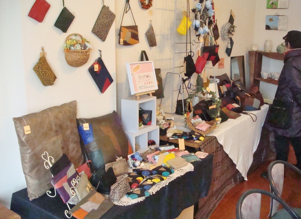 私たち夫婦が作っている革製品、娘が作ったフラワーアレンジメント、や古布の洋服などが展示即売されています。このイベントのために、久し振りにたくさんミシンを踏みました。