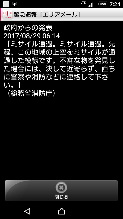 皆さんも朝から驚いたことと思いますが、私のスマホにもJアラートが届きました。
