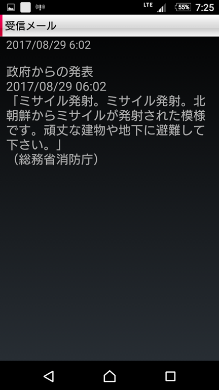 安倍首相は北朝鮮のミサイル発射の一部始終は完全に把握していると記者会見で言っていましたが、実際、発射されたのが午前5時58分とのことですから、その4分後には最初のJアラート、その12分後に上空通過のメールを受信。