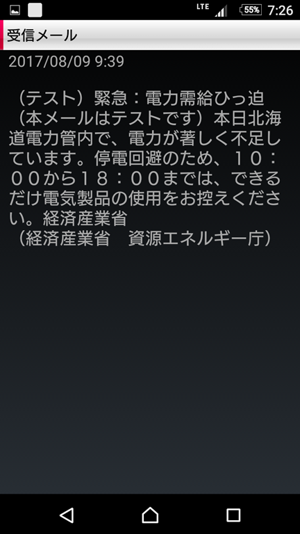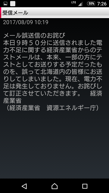 実は8月9日にもメールが突然来ましたので驚きましたが、右の写真のように誤送信だったものですから、今回も『何やってるんだろう!』『こんなんじゃ、オオカミ少年になってしまうネ』と妻と話しながら、テレビのスイッチを入れると、北朝鮮が弾道ミサイルを本当に発射してのメールでした。