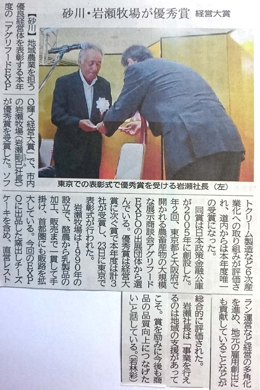 こちらは本日の道新です。砂川にある「岩瀬牧場」が「アグリフードEXPO輝く経営大賞」で優秀賞を受賞した記事が掲載されていました。