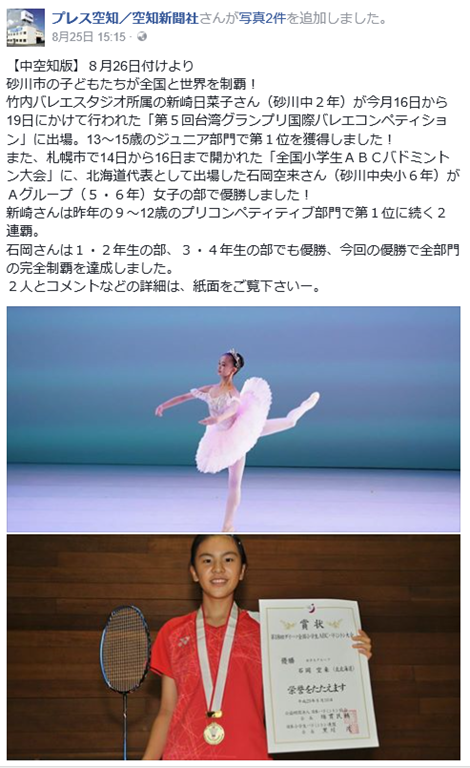 FBでは書かれていませんが、バドミントン大会で全国制覇した石岡さん(砂川中央小6年)は、砂川のバドミントンクラブの指導者に教わるためにお母さんと札幌から移住しているとのこと。