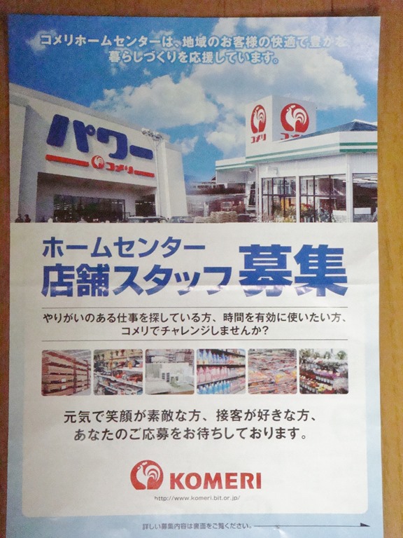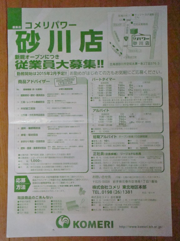 それに、商品アドバイザーといって、専門技術や経験を持った人たちを各販売品目によって9名募集をしています。今回のパワーコメリ砂川店の開店に伴って、80名を超える雇用が新しく生まれることは喜ばしいことです。