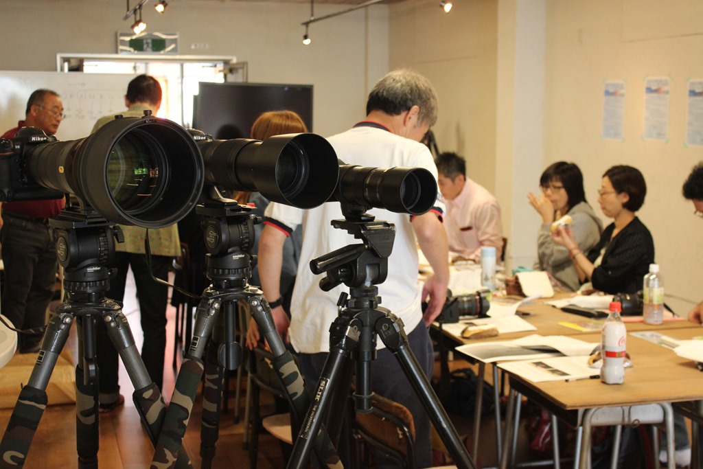 本日のテーマは「動物の撮影」でした。講師は動物写真家の「出口 大芳さん」で、左の写真は出口さん愛用のデカい望遠レンズです。