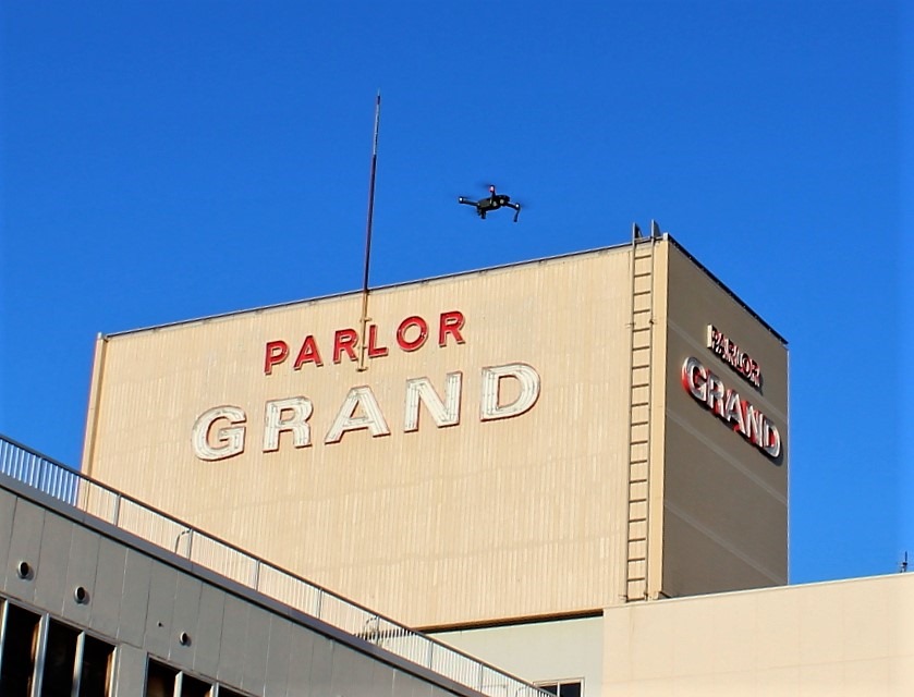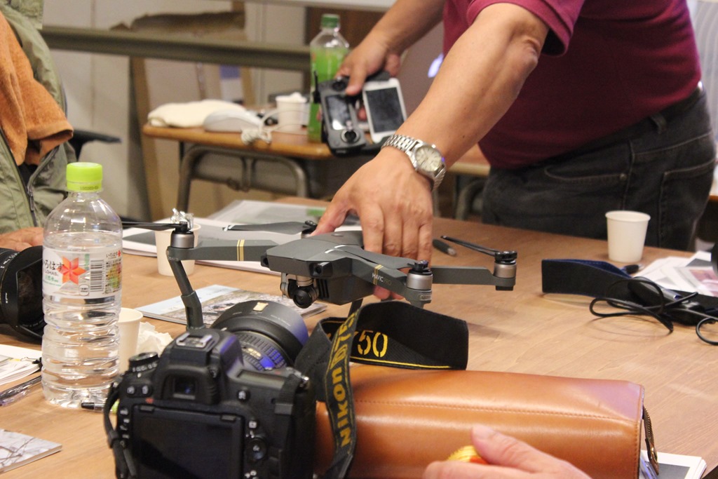 出口さんはドローンでの撮影もされるそうで、高性能のカメラ付きドローンが左の写真。どんな飛ばし方をするのか見せていただきました。