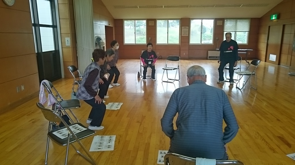 毎月第3金曜日は運動サロン「ニコニコ広場」が行われます。毎回、いきいき運動推進委員のボランティアさんが2名で約一時間、運動指導をしていただいています。