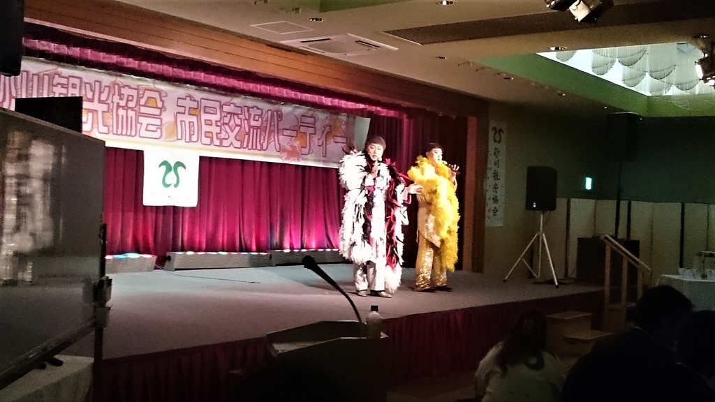 この交流パーティーの人気の高さは「出し物」。今年は昨年の人気で、連続の「何ン田研二ショー」で大盛り上がりと参加者の二人に一人は当たる「お楽しみ抽選会」です。