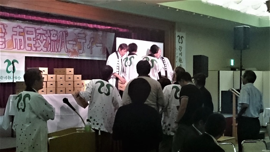 砂川観光協会が主催する「市民交流パーティー」が昨日、午後6時から開催されました。私は観光協会の理事なので、5時30分に集合してお手伝いですが、すでに一般のお客さんが並ばれていて、人気の高さをうかがわせます。