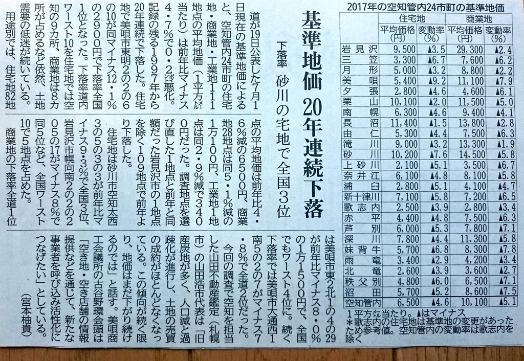 上の記事は9月20日付けの道新「空知版」です。空知管内24市町の基準地価が表になっていますが、空知では20年連続の前年比マイナスとのこと。