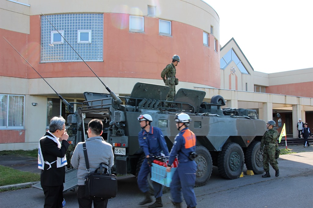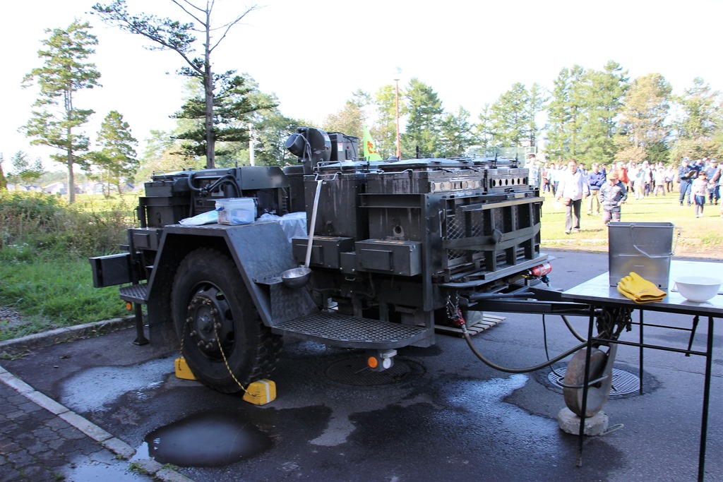 災害訓練ですから小学校前に自衛隊の装甲車があっても不思議ではありませんネ。上の右の写真は野外炊具車両で、こちらで炊いたご飯を炊き出し訓練でおにぎりにし、訓練の最後に参加者に配られました。