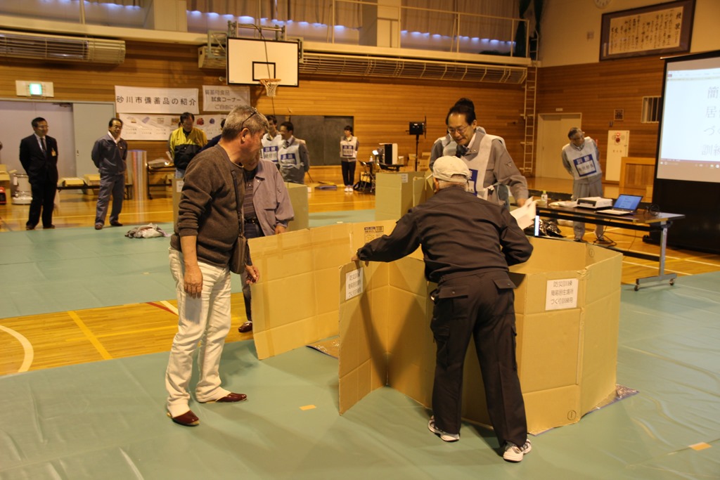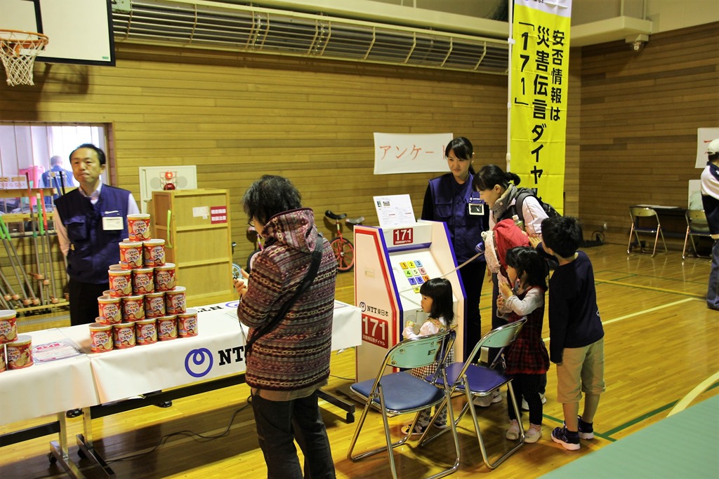 他にもNTTの「災害用伝言ダイヤル(171)無料体験ブース」や砂川市の備蓄品の展示(右の写真)が行われました。