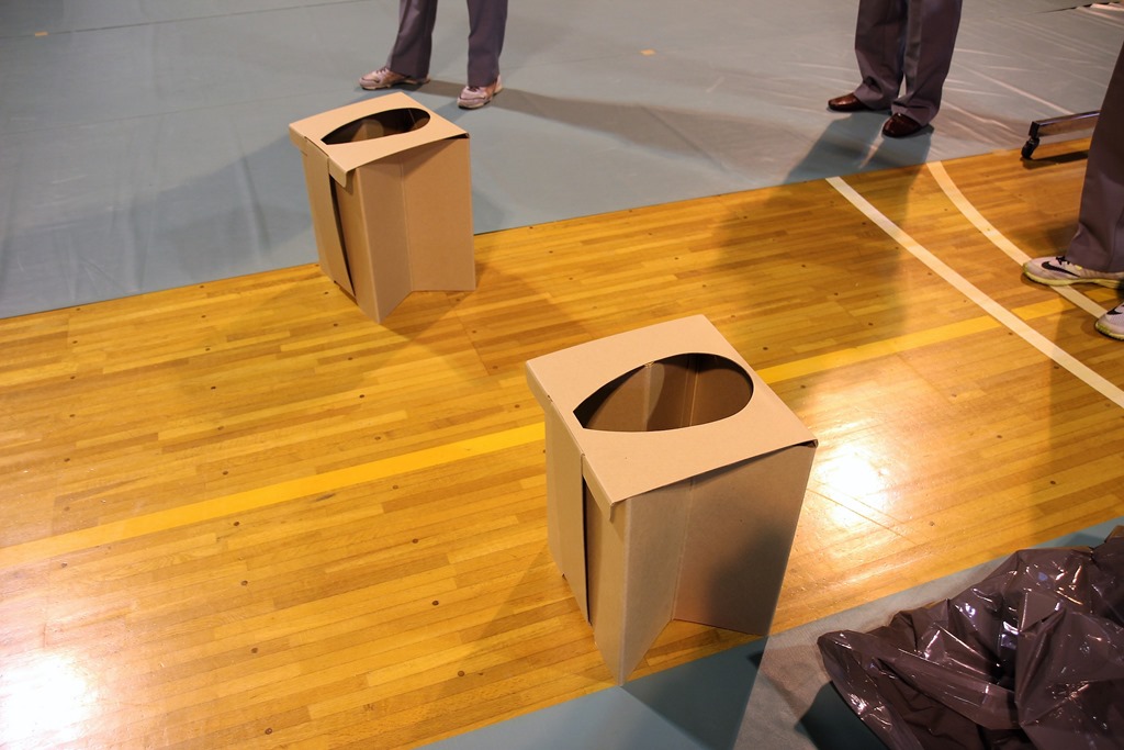 こちらは今回初めて見ましたが、ダンボールでできた簡易トイレです。使用後はビニール内に凝固剤を入れ、捨てられます。