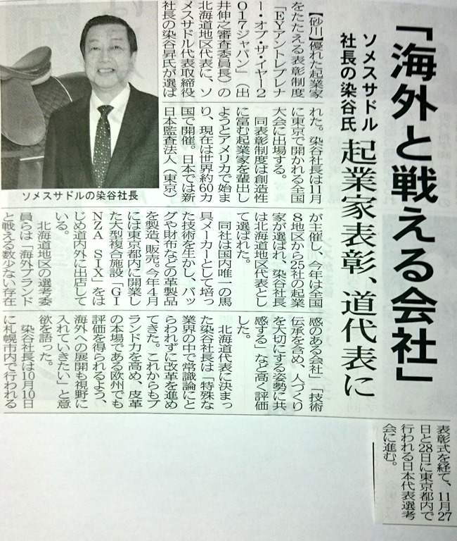 上の写真は9月30日付けの「プレス空知」の記事ですが、そのソメスサドルの染谷 昇社長が起業家表彰を受けたそうです。