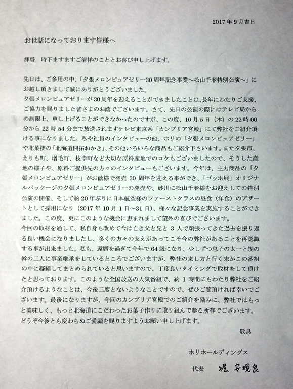 私の所にも届いた堀社長からのお手紙を紹介すると堀社長の人となりが分かっていただけるような気がしますのでUPしちゃいます。