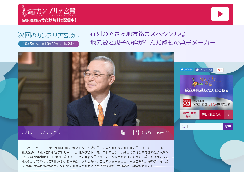 明日(5日)の午後10時30分からテレビ東京系列(北海道ではTVH)の「カンブリア宮殿」に㈱ホリと㈱北菓楼のホリホールディングス代表「堀 安規良さん」が出演。