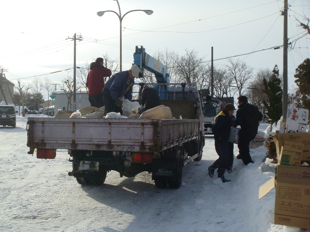 写真は今年最後の晴見町内会の「廃品回収」です。12月は資源ごみを一ヵ所に置くのが積雪のため困難で、集積場所を町内5ヵ所に分散しています。そこを業者さんの車で積み込み作業を手伝いながら回ります。