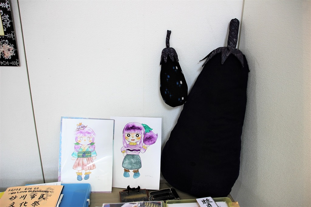 ちょっと写真が暗くて見づらいですが、ナスに関する特産品の試作「抱き枕」は古布で作られていますし、イラストは砂川高校の生徒達に書いてもらったそうです。パワーいっぱいです。