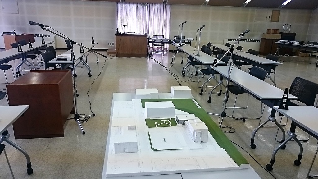 写真は市役所3階大会議室です。珍しいアングルですが大会議室の入り口から昼休みに撮りました。したがって誰も居ません。