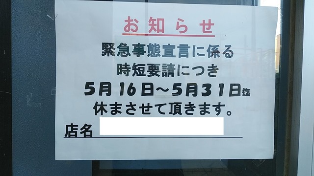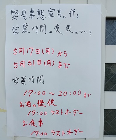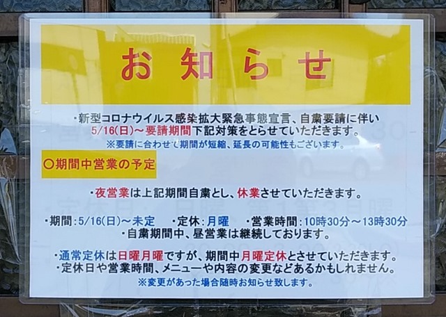 中心街のほとんどの飲食店は営業時間やお酒の提供は時間短縮を行なっていますし、バー、スナックのお店は期間中の休業を知らせる張り紙が貼られている厳しい状況です。