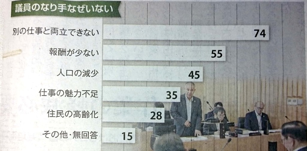 同じ記事中、別の表が上の写真です。議員のなり手がいない理由を答えたものです。